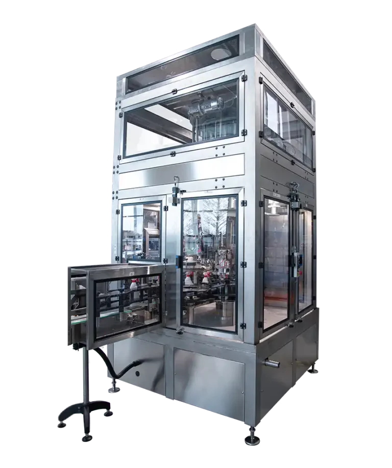 Machine suitable for filling and capping corrosive, acidic or alkaline products, such as bleach.