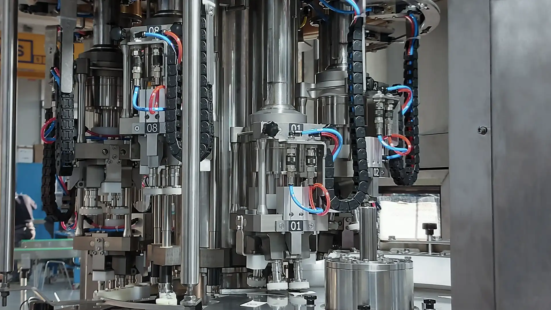 The KT model is a rotary capping machine for pump caps and triggers. It can be configured with up to sixteen heads, processing up to 12,600 bph. The machine is also available in an anti-corrosion configuration and an ATEX-certified version.