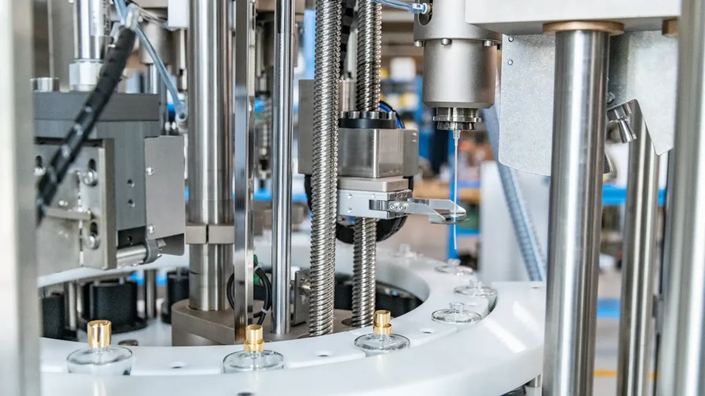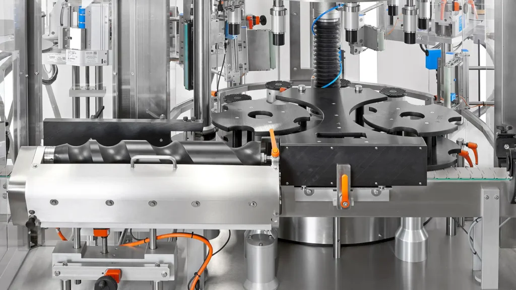 JULIET is a compact, highly efficient monoblock engineered for filling and capping small containers used across multiple industries, from cosmetics to perfumery and pharmaceuticals. Equipped with an advanced crimping system, the machine eliminates the need for a pre-crimping step thanks to a clamp that picks up, stretches, and applies the pump directly onto the container. Its gravity-fed channel, tilted at 45°, ensures a steady and gentle component flow without the need for air jets or vibration. The translating vacuum filling station, featuring four customizable filling nozzles, simplifies maintenance and format changeover operations. JULIET can be configured with additional stations for container cleaning and air-blowing, offering great flexibility to accommodate various packaging types and production line requirements.